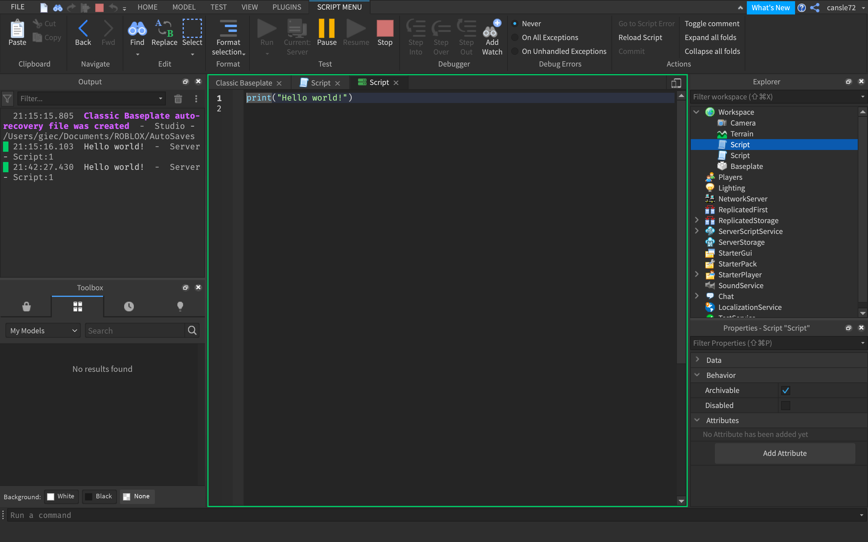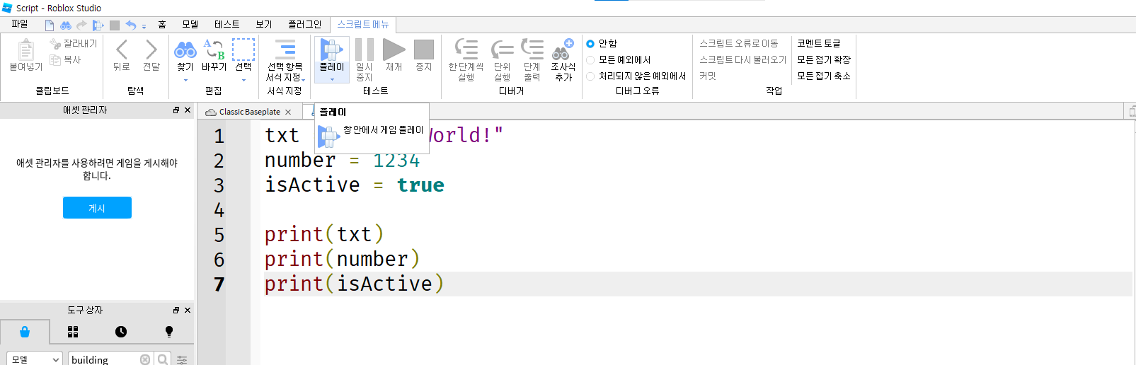 | [Robloxs Studio] 로블록스 스튜디오 #1. 루아(Lua) 기초 코딩 - 변수(Variable) 의 이해 와 출력 (0) | 2021.09.05 |